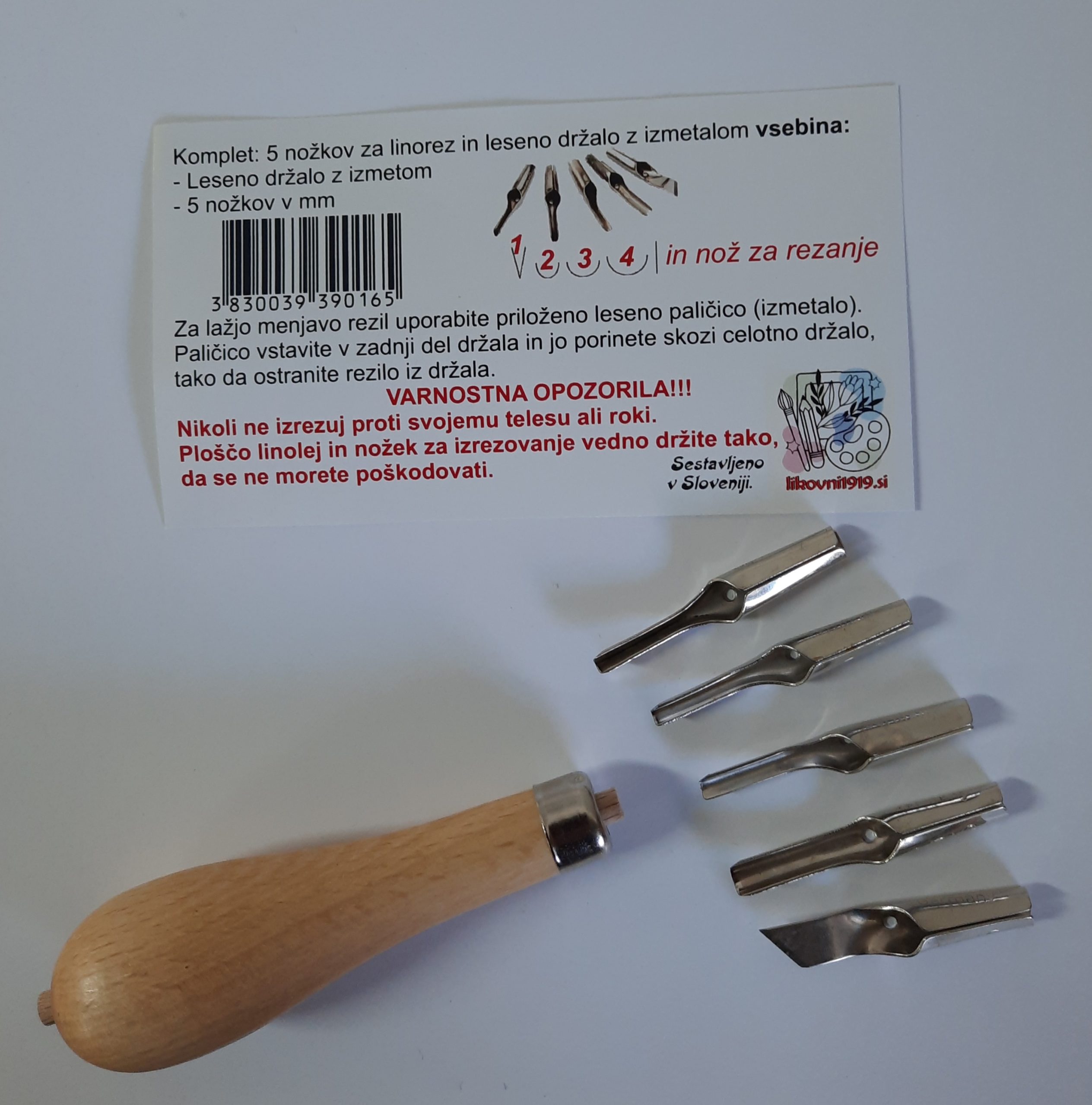 Najboljši nožki za linorez na slovenskem trgu - nemške kvalitete! Komplet vsebuje 5 nožkov in držalo z izmetalom v PVC mapi. Nožki za linorez so izdelani iz visoko kakovostnega 0,6 mm debelega valjanega kaljenega jekla, kar zagotavlja odlično ostrino rezila tudi po daljši uporabi. Držalo je iz bukovega lesa s palčko za lažji izmet nožka.